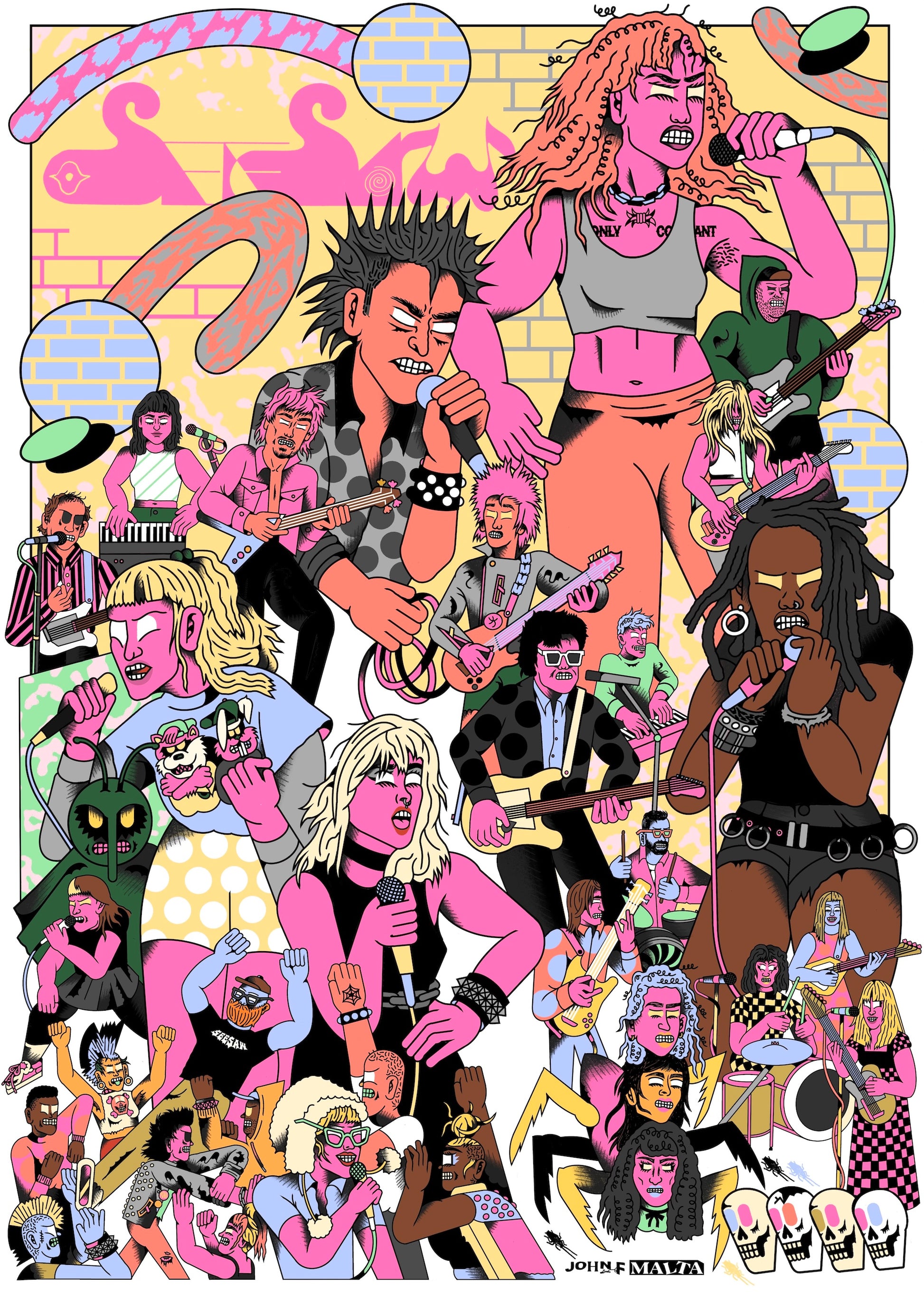a newsprint broadsheet featuring art by john f. malta + a list rounding up the 52 best punk and rock'n'roll records of 2024 according to see/saw, featuring outstanding artwork and writing. not posting it online! it is a physical object.